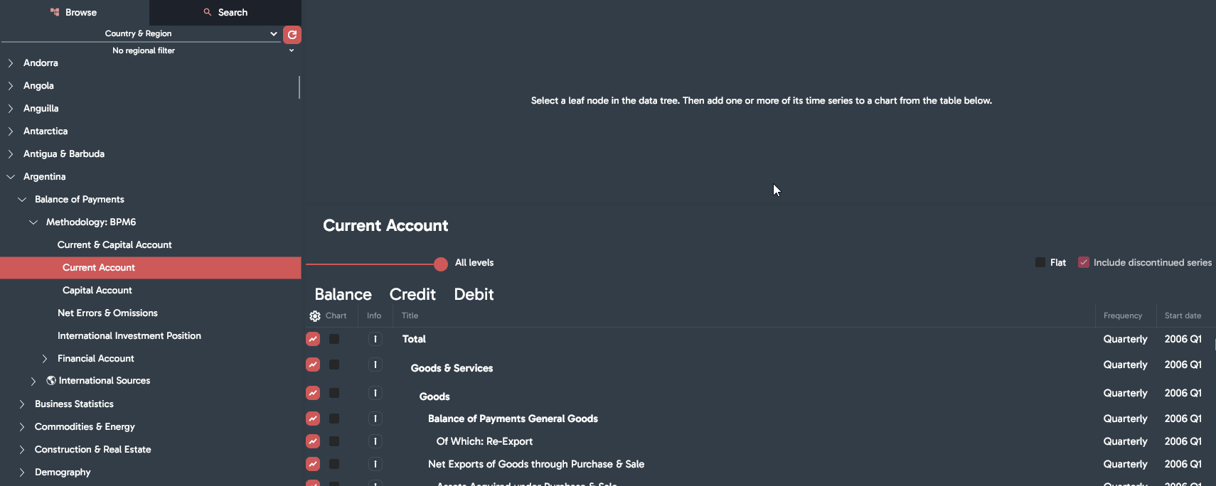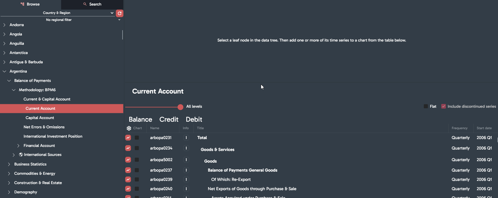 Left panel contains Data-tree tab for browsing through time series and Search tab.