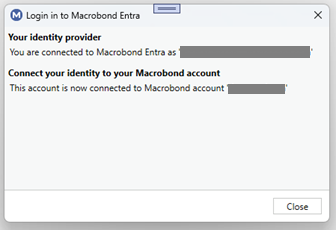 The Macrobond account and the MS Entra account are now connected. In the rare event that you want to disassociate a Macrobond account from an account in MS Entra, please contact the Macrobond support team.
